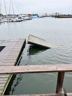 Stormen Amy har været hård ved vores flydebro, som nu trænger til lidt kærlig opretning – den hænger med ørerne!
